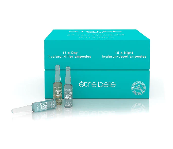 Hyaluron-Filler Ampoule for instant and sustainable wrinkle filling. With low molecular weight and lposomal encapsulated hyaluronic acid and two active hyaluronic acid boosters. Deep-effectively redeployed the production of skin-like hyaluronic acid and can populate wrinkles from inside, fill and smooth. 15x hyaluron depot ampoules for the night